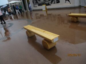 「関西パビリオン」前広場 「兵庫県産木材」で作成したベンチ (弊社の丸棒丸太が使われています)
