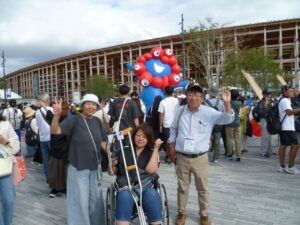 閉幕日の入場がかなって、「ミャクミャク」と最後の記念撮影