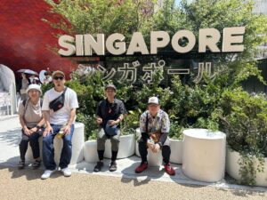 シンガポール館出口の記念撮影用丸太スツール前で記念撮影